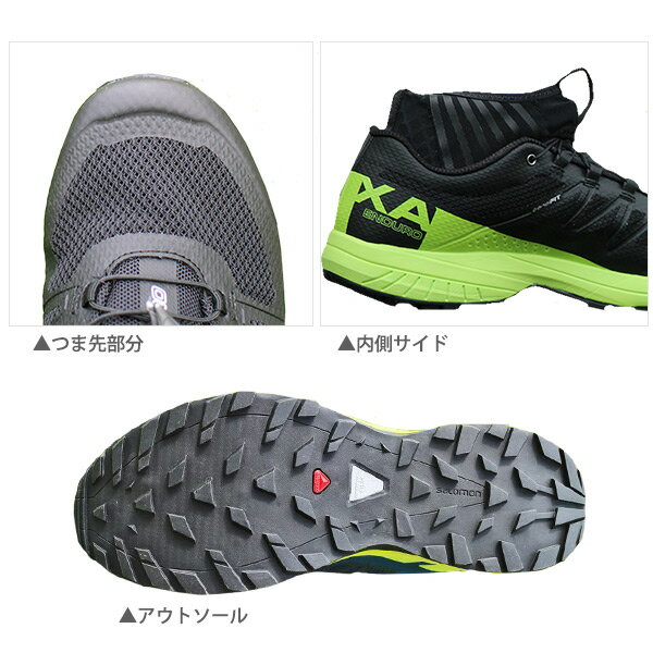 SALOMON スポーツシューズ トレイルランニング ■XA ENDURO/L39240700 WEIGHT WOMEN:265g(24.0cm)MEN:300g(27.0cm) UPPER ・Breathable open mesh ・Protective Strech Gaiter ・Friction free lace eyelet ・Quicklace ・Sensifit SOLE CONSTRUCTION OUTSOLE:Premium Wet Traction Contagrip CHASSIS:Advanced Chassis、 Profeel Film MIDSOLE:Dual density EVA、EnergyCell + SOCKLINER: Molded EVA STACK HEIGHT 25mm/17mm (8mm drop) トレイルランニングシューズテクノロジーを用い、山道も河原も安全に安定して駆け巡れ、アッパーは耐久性に優れながら、高い通気性を発揮するメッシュを採用し、高温地帯、湿地帯も快 適に行動出来る。