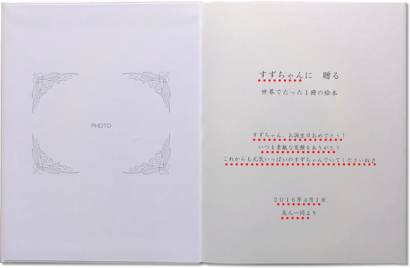 【検索用キーワード】 オリジナル絵本ショップ / オーダーメイド絵本 / クリエイト・ア・ブック / 世界で一冊の絵本 / ネットショップ / 名入れ / 誕生日 / 誕生日プレゼント / オリジナル絵本 / 絵本 / ギフト絵本 / ラッピング無料 / ギフトラッピング / 無料ラッピング選択 / のし対応 / ギフト対応 / ギフト直送対応オリジナルデータのご記入は記入のポイントも参考にご覧ください。