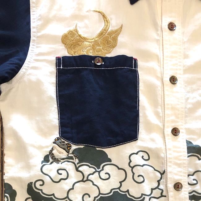 右胸には三日月に雲唐草の黄金刺繍、ポケットの下雲の合間からは抜群のあどけない表情で覗く蛙刺繍です。